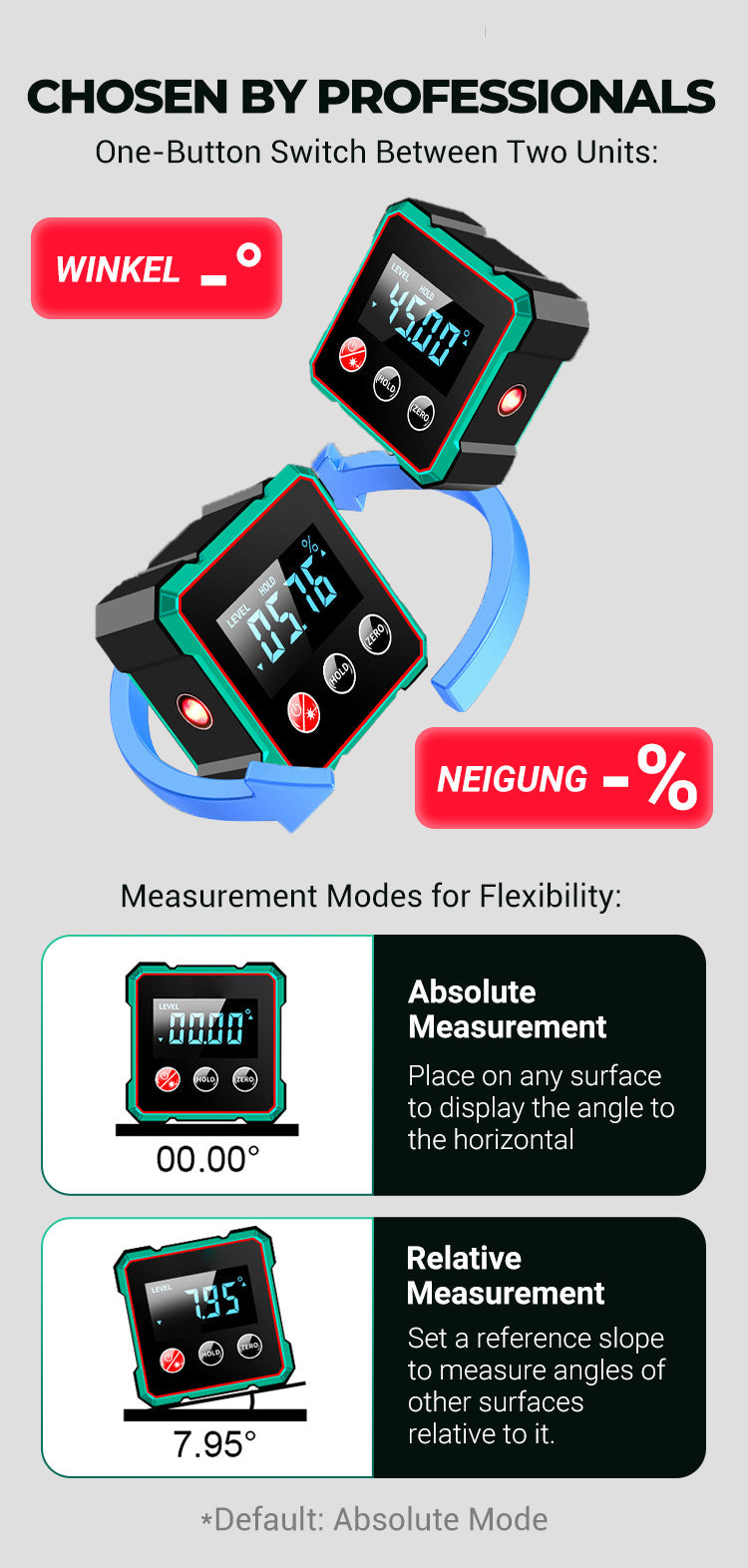 Yes! It supports absolute and relative measurement modes — so you can easily measure angles or slope percentages with one button.